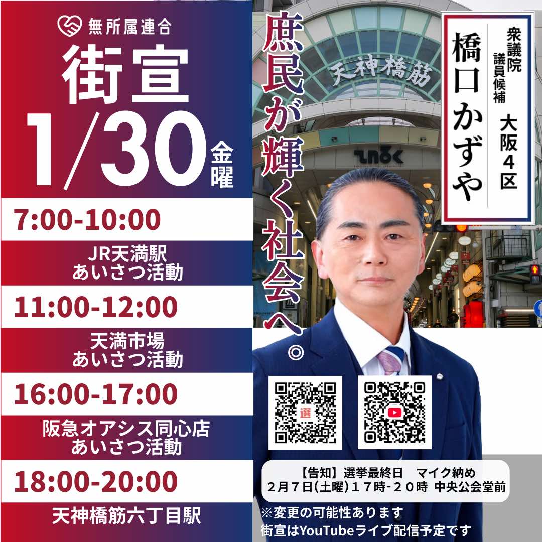 1月30日 橋口かずやの街宣予定です