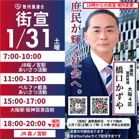 1月31日 橋口かずやの街宣予定です