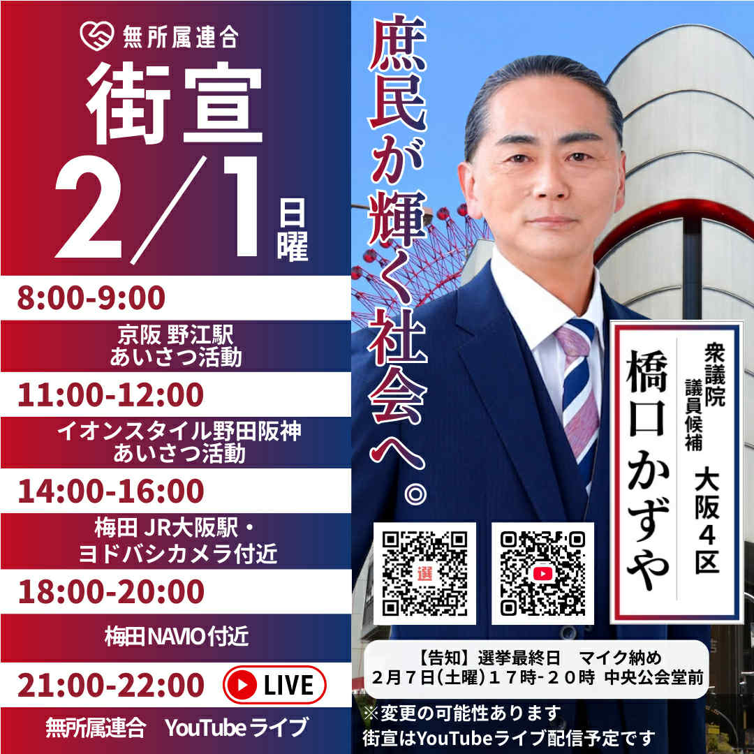 2月1日 橋口かずやの街宣予定です