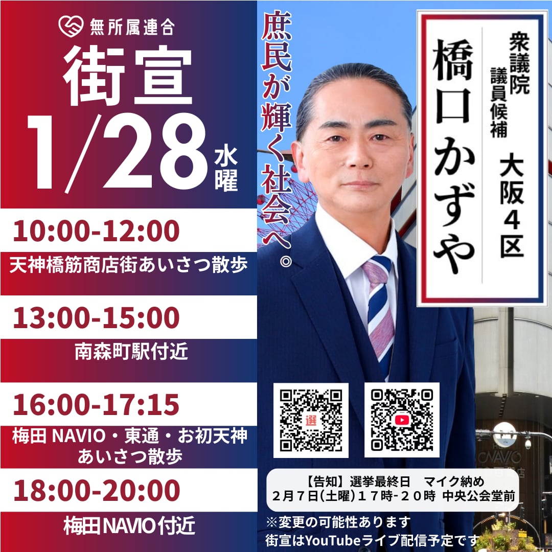 1月28日 橋口かずやの街宣予定です